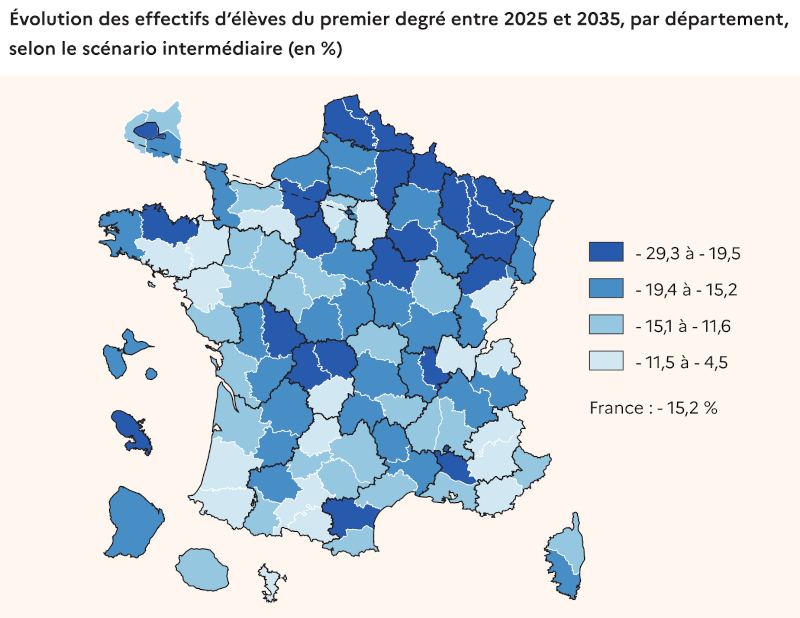 La Statistique publique de l’éducation (DEPP), service du ministère de l’Éducation Nationale, vient de publier une étude prospective sur l’évolution des effectifs d’élèves dans les 10 prochaines années : « Les projections d’effectifs scolaires à horizon 2035 s’inscrivent dans un contexte démographique marqué par une baisse des naissances amorcée depuis 2010 et qui s’est accentuée ces dernières années […] Au total, la baisse des effectifs s’établirait à 1,7 million d’élèves en dix ans, avec des évolutions contrastées selon les académies et les départements. » Les écoles perdraient 933.000 élèves, les collèges et lycées 800.300, établissements publics et privés sous contrat confondus. Les données sont détaillées par départements et académies.