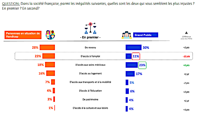 L’IFOP publie une étude commandée par l’Observatoire de l’emploi et du handicap (Agefiph, FIPHFP et Ladapt) sur l’égalité des chances en emploi. Menée auprès de 6.000 personnes (personnes handicapées, population, salariés, dirigeants), elle constate que la société française est majoritairement considérée comme injuste par le grand public (68%) et davantage par les personnes handicapées (78%, dont 26% de très injuste) ; « les personnes sondées citent les inégalités de revenus (30% des Français et 28% des personnes en situation de handicap), d’accès aux soins médicaux (23% et 18%), d’accès au logement (17% et 16%). » Près des 2/3 des personnes handicapées déclarent subir des traitements injustes dans le cadre professionnel, contre 36% pour l’ensemble de la population. 10% seulement des personnes handicapées n’ont pas le sentiment de subir des inégalités de traitement contre 30% de la population. Les 2/3 des travailleurs handicapés ont dû changer de métier ou de poste du fait du handicap et ils ont pour moitié subi des discriminations. Pour remédier, la sensibilisation et la formation des managers et salariés est privilégiée par 43% des dirigeants. D’autres aspects sont passés en revue dans cette étude, dont la promotion professionnelle, la méconnaissance du handicap, l’aisance dans diverses situations professionnelles.