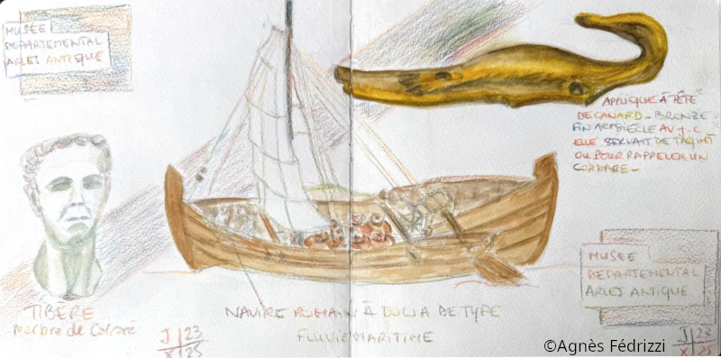 Au musée départemental de l'Arles antique. Tibère, buste en marbre de carrare. Navire romain de navigation fluviomaritime. Applique à tête de canard – bronze fin 1er avant J-C. Elle servait de taquet ou pour rappeler un cordage ©Agnès Fédrizzi