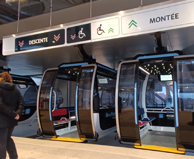 Île-de-France Mobilités a inauguré et mis en service en grande pompe sa première ligne de téléphérique reliant le terminus de la ligne 8 du métro de Créteil à Villeneuve-Saint-Georges (Val de Marne). D’une longueur de 4,5km, la ligne comporte trois arrêts à Limeil-Brévannes, Fontaine-Saint-Martin et Valenton permettant de désenclaver cette partie du département. Si toutes les gares sont accessibles, l’accès des clients en fauteuil roulant ou rollator nécessite d’être aidé du fait de l’étroitesse des cabines : un employé doit y entrer au préalable pour relever une banquette du fond bloquée par une tirette, puis sortir pour que le voyageur puisse entrer et se positionner au fond. A la descente entre les terminus, les autres voyageurs doivent se lever alors que le règlement les oblige à voyager assis. « On peut constater que les genoux des voyageurs nous empêchent de passer, explique Laurence Devilette, représentante départementale de l’APF France Handicap. Il faut compter sur le civisme des gens. Normalement, un agent sur le quai doit intervenir, mais est-ce qu’on va devoir demander l’autorisation pour pouvoir entrer dans une cabine ? Est-ce que c’est vraiment l’accessibilité à 100% ? » Si des représentants associatifs ont été consultés, c’est après qu’IDFM a choisi le modèle de cabine : « On nous a répondu, c’est trop tard », conclut-elle. Cette étroitesse empêche également d’emprunter la ligne avec un scooter à 3 ou 4 roues, ou avec un système de 3e roue. Les autres téléphériques urbains, à Brest et Toulouse, emploient des cabines plus vastes offrant, elles, un accès en autonomie.