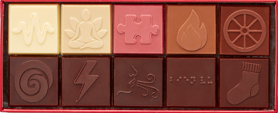 Conférencière-influenceuse elle-même handicapée, Tiffany Mazars a collaboré avec Jadis & Gourmande pour concevoir un coffret de chocolats de Noël, Faire fondre les préjugés. Chacun des 10 grands carrés est estampé d’un pictogramme en relief symbolisant un handicap, associé à un type de fève de cacao : braille-cécité chocolat noir de Tanzanie, chaussette-trisomie chocolat noir des Philippines, pièce de puzzle-maladies rares chocolat Ruby naturellement rose, yoga-troubles psychiques chocolat blanc végétal, etc. L’ensemble invite à la fois à la dégustation et la réflexion autour des différents handicaps. Le coffret Faire fondre les préjugés est vendu 19,80€ dans les boutiques Jadis & Gourmande et en ligne. Il est réalisé par un ESAT de Brétigny-sur-Orge (Essonne) et le QR code du carton descriptif donne accès sa version audio.