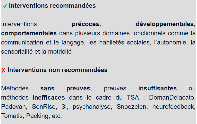 La Haute Autorité de Santé publie la révision de ses « recommandations pour aider les professionnels dans leurs pratiques, qu’ils soient issus du secteur sanitaire, social, médico-social ou encore de l’éducation […] Les interventions recommandées par la HAS sont développementales et comportementales. » Elle exclut expressément les « méthodes sans preuves, preuves insuffisantes ou méthodes inefficaces dans le cadre du TSA : DomanDelacato, Padovan, SonRise, 3i, psychanalyse, Snoezelen, neurofeedback, Tomatis, Packing, etc. » Ces « soins » pratiqués par des établissements sanitaires, médico-sociaux ou par des professionnels en secteur libéral se retrouvent de facto interdits dans la prise en charge des enfants et jeunes vivant avec des troubles autistiques. La précédente version de ces recommandations datait de 2012. Les travaux de la HAS sur l’autisme et ses troubles sont consultables sur cette page.