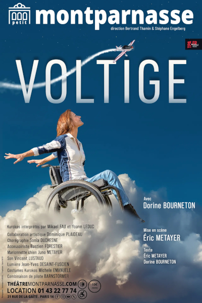 Voltige, d’Éric Metayer en collaboration avec Dorine Bourneton, au Théâtre Montparnasse. « Voltige raconte le destin exceptionnel de Dorine Bourneton. À 16 ans, seule survivante d’un crash d’avion, elle deviendra la première femme paraplégique au monde pilote de voltige. Entre théâtre et danse, le spectacle retrace son envol : un voyage de force, de colère et de rire dans lequel le corps et le rêve défient la gravité. Portée par les mystérieux Kurokos du théâtre japonais, la scène devient avion, obstacle ou vague… Le monde intérieur d’une femme qui a choisi de se dépasser et de voler, envers et contre tout ! » Lieu : Théâtre Montparnasse, 31 rue de la Gaîté à Paris (14e). Avec Dorine Bourneton, Mikael Fau et Yoann Leduc. Séances : mercredi, jeudi, vendredi et samedi à 19h, dimanche à 17h, relâches les 21 & 22 mars. Tarifs 36€ / 20€ / 10€ pour les moins de 26 ans au guichet ou par téléphone.