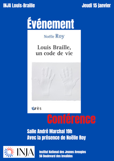 Louis Braille un code de vie, conférence de Noëlle Roy à l’INJA. « Dans le cadre de la Journée mondiale du braille et à la suite de la sortie de son livre Louis Braille un code de vie aux éditions Eres, l’INJA-Louis Braille a le plaisir de vous convier à une conférence avec Noëlle Roy. Louis Braille, un code de vie est une biographie de Louis Braille. C’est un récit qui réévalue l’histoire de Louis Braille et de la genèse de ce système de lecture et d’écriture pour les aveugles. Aujourd’hui à la retraite, Noëlle Roy était conservatrice du musée et de la bibliothèque patrimoniale Valentin Haüy. » Lieu : Institut National des Jeunes Aveugles INJA-Louis Braille, salle André Marchal, 56 Boulevard des Invalides à Paris (7e). La conférence sera ouverte par une intervention musicale, dont le thème sera Louis Braille. Conférence gratuite sans inscription.