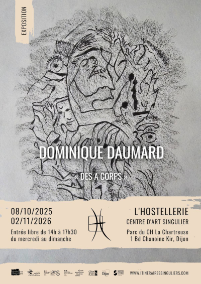 Des A Corps, exposition consacrée à l’artiste Dominique Daumard, à L’Hostellerie. « À travers ses textes et ses dessins, Dominique Daumard témoigne de ce que vivent les personnes en souffrance psychique. Ses créations traduisent le désarroi, les peurs et les angoisses du quotidien, tout en interrogeant le regard extérieur, souvent marqué par la méfiance ou l’évitement. Une invitation à ressentir et à mieux comprendre, au-delà des apparences.  » Lieu : L’Hostellerie – Centre d’Art Singulier au Centre Hospitalier La Chartreuse, 1 boulevard du Chanoine Kir à Dijon (Côte d’Or). Du mercredi au dimanche de 14h à 17h30. Entrée libre.