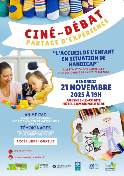 Ciné-débat sur l’accueil des enfants en situation de handicap à l’Hôtel Communautaire. « Dans le cadre de la sensibilisation sur l’accueil des enfants en situation de handicap chez une assistante maternelle, le Relais Petite Enfance Ô P’tits Mômes des Campagnes de l’Artois organise un Ciné-débat avec partage d’expérience à destination des parents et des professionnels(les) de la petite enfance. Cet événement sera animé par une intervenante de l’association Gamins Exceptionnels et une psychomotricienne du CAMSP de Saint-Pol-sur-Ternoise. Ce temps débutera par le visionnage d’un film documentaire et se poursuivra par des témoignages et des échanges. » Lieu : Hôtel Communautaire, 1050 avenue François Mitterrand à Avesnes-le-Comte (Pas-de-Calais). Accès libre et gratuit.