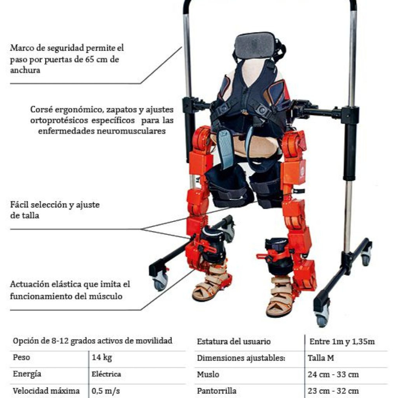 Les enfants sont souvent incapables de marcher à cause des troubles neurologiques, ils présentent des symptômes complexes en termes de mouvements articulaires. De ce fait, le défi va bien au-delà d’une simple adaptation de la robotique aux enfants, un exosquelette pédiatrique se doit d’être adaptable et ajusté aux symptômes de chaque enfant. Elena García Armada s’est tournée vers la pédiatrie en inventant une combinaison réglable en titane, reliée à une batterie et un réseau de petits moteurs avec des capteurs, des logiciels et des machines. Ces éléments fonctionnent conjointement comme des articulations mécaniques s’ajustant au corps et amplifiant les mouvements légers tout en s’adaptant aux mouvements de chaque enfant au fur et à mesure de sa rééducation.
