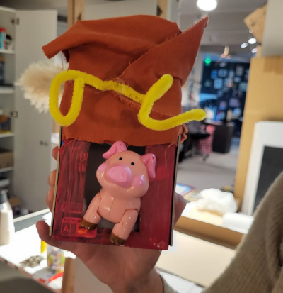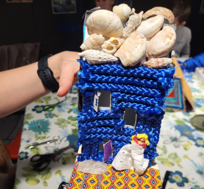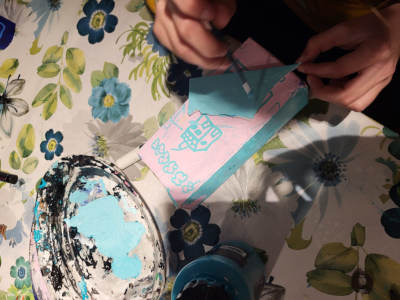 Pour l’atelier cabane, les participants formaient des petits groupes encadrés par les jeunes animateurs, laissant libre cours à leur créativité. Par exemple, la cabane d’Hélène est parée de tissu brillant, elle est aidée par Marius, l’un des animateurs, le seul à accepter d’exprimer sa motivation pour animer : « Je suis venu pour aider tout le monde, je suis déjà venu au musée Soulages. Et j’aime apprendre aux autres. » Sa maison peinte, parce que lui aussi construit tout en conseillant, est surmontée d’un gros bouchon en guise de cheminée. Il s’est préparé avec un éducateur au musée, et participe régulièrement à un atelier terre-céramique dans son établissement. Cathy explique à Cindy comment orner sa maison ; elle vient souvent au musée, où elle fait de la musique et de la danse avec des adhérents du Groupe d’Entraide Mutuelle. Elle est là en tant que participante et a décoré une maison habitée par un cochon aussi rose que souriant !